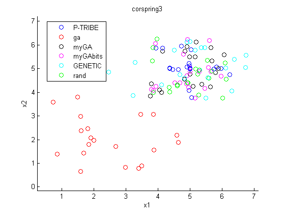 Here you can see a distribution of the solution points in one of the planes in the 3 variable space with the Corrugated Spring Function. Each dot in this plot represents the final solution point found by the optimization method. It is pretty clear that MATLABs GA never really leaves the center 1/3 of x values (x values of 0 to 5). All of the other methods have settled near the (5,5) area.